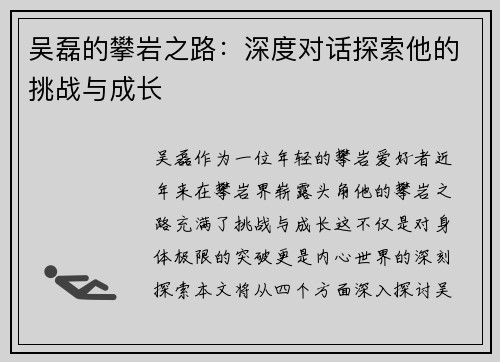 本文将对南京攀岩队的控制打法进行深入分析与战术应用解读。南京攀岩队以其独特的战术风格和高效的团队配合而闻名,本文将从四个方面详细探讨他们的控制打法,包括技术要素、战术布局、心理策略以及训练方法。这些方...